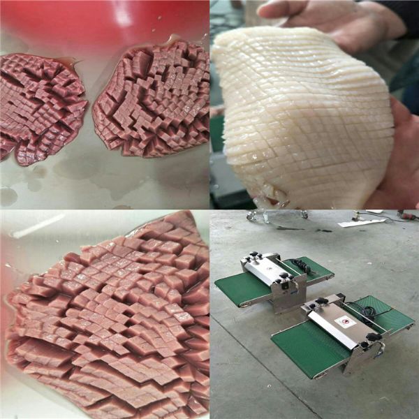 可用于猪腰子、牛腰、羊宝以及鱿鱼、鲍鱼 等的切花,切出的花型线条干净利落,无一丁点肉渣,切花速度快,不论是切花效果、外观,还是速度都是人工无法比的。